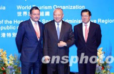 香港特首董建華(中),7月14日在會展中心與博鰲亞洲論壇秘書長龍永圖(右)及世界旅游組織秘書長弗朗加利主持“重振亞洲旅游業(yè)會議”開幕禮。中新社記者:洪少葵