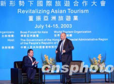 “重振亞洲旅游業(yè)會議”7月14日在香港舉行,行政長官董建華在致辭時表示,SARS對香港的影響看來只是短暫,香港經(jīng)濟和旅游業(yè)正在復(fù)蘇,來自美加、日本及東南亞和內(nèi)地的旅客開始回升。中新社記者:洪少葵