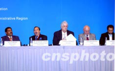 2003年7月14日在香港舉行的“重振亞洲旅游業(yè)會(huì)議”全體大會(huì)上,[左起]瓦努阿圖旅游部長Jean Alain Mahe、孟加拉國國民用航空和旅游部長Mir Mohammad Nasir Uddin、加拿大旅游委員會(huì)副總裁Thomas Penney、世界旅游旅行委員會(huì)主席鮑姆加騰、伊朗駐華大使Fereydoun Verdinejad等嘉賓出席會(huì)議并發(fā)表專題演講。中新社記者:洪少葵