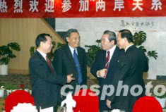 來自臺灣、香港、澳門以及海外和中國大陸的百余位專家學者十六日抵達麗江,出席十七日即將舉行的2003年海峽兩岸關系論壇。圖為國務院臺辦副主任王在希、海研中心主任唐樹備、云南省副省長邵琪偉與來自臺灣的郭俊次先生一起交談。中新社記者:毛建軍