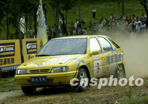 2003年中國汽車拉力賽第二站比賽16日在吉林省長春市雙陽區(qū)舉行,來自全國的56輛賽車參加本次比賽,46輛賽車完成了第一天的比賽,圖為曾在第一站比賽中駕駛東風雪鐵龍·神龍富康車的北京海駕車手周勇在比賽中。中新社記者:趙振清