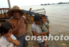 七月中旬的淮河洪水迫使安徽省穎上縣多處行洪區(qū)緊急破堤行洪,許多百姓被困在滔滔洪水中的高臺地帶,救濟成為當務(wù)之急。圖為洪水圍困邱家湖行洪區(qū)堤上的農(nóng)民。中新社記者:賈國榮