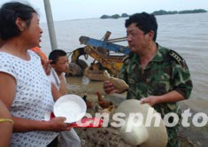 安徽省穎上縣半崗鎮(zhèn)空臺村的一千多名男女老少,因邱家湖七月十二日破堤行洪而被洪水四面圍困,災民們吃的是用發(fā)霉的麥子做的面餅,不少人吃后都肚子痛。圖為災民讓乘船前來看望的解放軍軍分區(qū)指揮員嘗一口這種面餅。中新社記者:賈國榮