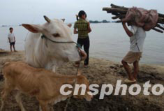 安徽省穎上縣半崗鎮(zhèn)空臺村的一千多名男女老少,因邱家湖七月十二日破堤行洪而被洪水四面圍困,百姓和牛羊家畜擠在孤土堤上,衛(wèi)生條件令人擔憂。中新社記者:賈國榮