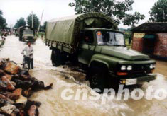 解放軍南京軍區(qū)急調(diào)軍車,向七月中旬淮河行洪區(qū)的安徽省阜陽地區(qū)運送救災(zāi)品。當?shù)剞r(nóng)村到處是內(nèi)澇洪水,車隊涉水直奔災(zāi)區(qū)。作者:閆宏宇