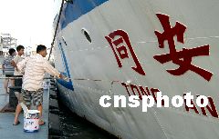 “同安”號船員正在岸邊給船體進行油漆刷新。