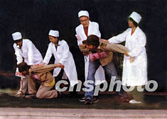 北京首都醫(yī)科大學(xué)的大學(xué)生們,近日在學(xué)校大禮堂舞臺演出活報劇《抗“非典”》。圖為身穿醫(yī)療防護(hù)裝的“醫(yī)護(hù)人員”將“非典病毒”捉拿歸案,以示正法。作者:首醫(yī)