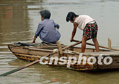 七月的淮河洪水下降緩慢,在安徽省淮南市郊被淹的農(nóng)田水面上,一名小女孩駕著簡易木船,幫助奶奶打撈浮在洪水中的東西。中新社記者:賈國榮