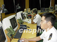 今年第八號(hào)強(qiáng)熱帶風(fēng)暴“天鵝”預(yù)計(jì)二十一日傍晚在海南到湛江一線沿海登陸,湛江海事局交管中心工作人員利用先進(jìn)的船舶交管系統(tǒng)(VTS)指揮船舶做好防風(fēng)準(zhǔn)備。作者:潘文