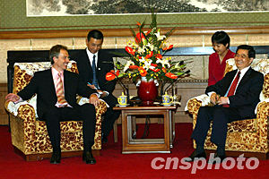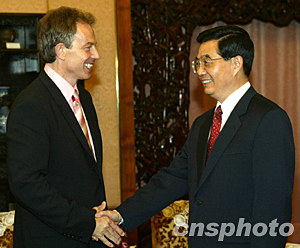 中國國家主席胡錦濤二十一日在北京會(huì)見英國首相布萊爾。中新社記者:滿會(huì)喬