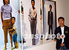 “香港藝術(shù)雙年展2003”,七月二十二日在香港藝術(shù)館舉行新聞發(fā)布會,此次展覽共收到1500多件參賽作品,最后評選出十個優(yōu)秀獎。圖為胡健一向賓客介紹他的攝影作品《游人》。中新社記者:錢興強