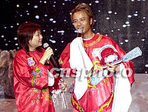 眾歌星7月22日在香港九龍灣展貿(mào)中心出席商業(yè)電臺(tái)《03之夏903給你一個(gè)星級(jí)會(huì)所·仙樂都》記者會(huì),歌星李克勤一身古裝新郎裝飾,打扮搶鏡介紹活動(dòng)詳情。作者:鄧慶樂