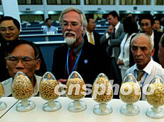 出席第五屆亞歐經濟部長會議的官員們利用會議間歇,來到大連商品交易所,查看大豆等交易商品的樣品。中新社記者:鄭萍萍