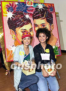 人氣組合Twins兩名成員鐘欣桐(左)、蔡卓妍7月23日在香港出席《Jelly Belly“Twins”糖豆畫》宣傳活動,“Twins”糖豆畫用上五十種顏色壹萬粒Jelly Belly糖豆黏到木板上成畫。作者:鄧慶樂