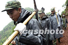 解放軍官兵二十三日冒雨前往受災(zāi)嚴(yán)重的云南省大姚縣曇華鄉(xiāng)山區(qū),參加抗震救災(zāi)。中新社記者:毛建軍