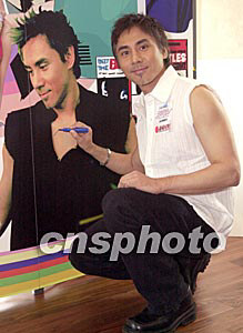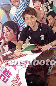 歌星黃凱芹7月24日在香港出席新城電臺廣播劇《都市情色》記者會。黃凱芹在宣傳墻報(bào)自已的肖像上簽名。作者:鄧慶樂
