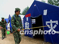 安徽省淮河洪水災(zāi)區(qū)的阜南縣王家壩又遇七月下旬的高溫,當(dāng)?shù)匚溲b部派出民兵緊急噴灑消毒劑防疫。中新社記者:賈國榮