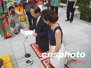 臺灣名人章孝嚴(yán)和夫人黃美倫,二十七日上午到廣西桂林鳳凰嶺下的生母章亞若墓前祭奠。作者:中新社廣西分社