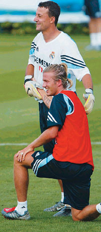 在隨后11打11的大對抗中,小貝仍然被分在替補一組,表現(xiàn)平平。在后衛(wèi)的緊逼之下,小貝在曼聯(lián)時那種姿態(tài)優(yōu)雅的傳中根本看不到。而在一次回防時,小貝竟將齊達內(nèi)的傳球鏟進了自家大門。這個烏龍球也成了小貝在昨天訓(xùn)練中唯一的收獲。