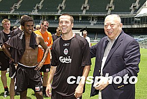 香港行政長(zhǎng)官董建華,七月二十六日到香港大球場(chǎng)觀賞利物浦的賽前熱身訓(xùn)練。圖為董建華與球員談笑甚歡。中新社圖