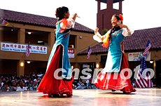 北加州華人運動會好時威之夜頒獎晚會七月二十六日晚在美國圣荷西市舉行,生活在美西灣區(qū)的華裔演藝人士為頒獎晚會獻(xiàn)上了精彩的演出。圖為中華演藝學(xué)院的學(xué)員表演蒙族舞《情思》。作者:陳鋼