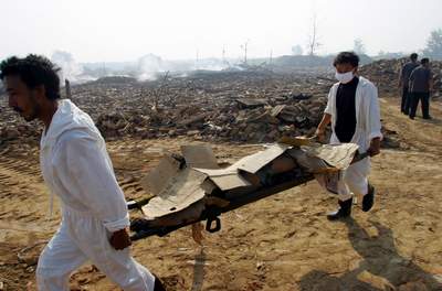圖:醫(yī)務(wù)工作者搶運辛集爆炸煙花廠遇難者
