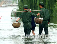 圖:武警戰(zhàn)士護(hù)送淮河災(zāi)民返鄉(xiāng)