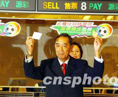 圖為馬會(huì)主席夏佳理在投注站購(gòu)得第一張足球博彩票。