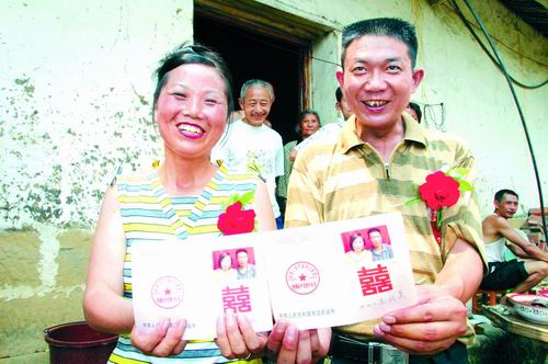 7月30日,曹學(xué)良、王代英領(lǐng)取了大紅的《結(jié)婚證》,新的生活開(kāi)始了!婚禮在幸福的包圍中進(jìn)行昨日凌晨4時(shí),心情激動(dòng)的王代英就醒了。她悄悄起身收拾房間打掃院落,在房門(mén)上貼上紅紅的“喜”字。早上6時(shí),前來(lái)幫忙的幾十位親戚朋友來(lái)到小院,各司其職,張羅著婚禮的各項(xiàng)事宜。