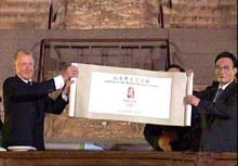 載著奧運會會徽的車輛從中華世紀壇出發(fā),經(jīng)過長安街,經(jīng)過半小時的運送經(jīng)達天壇,由鄧亞萍和成龍護送進入現(xiàn)場。