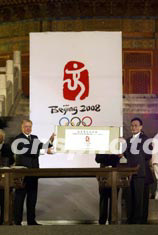 中共中央政治局常委、全國(guó)人大常委會(huì)委員長(zhǎng)吳邦國(guó)和國(guó)際奧委會(huì)協(xié)調(diào)委員會(huì)主席維爾布魯根將這方以“中國(guó)印·舞動(dòng)的北京”命名的會(huì)徽徽寶,飽蘸紅色印泥,在中國(guó)宣紙上鄭重蓋下了印記。從這一刻起,舞動(dòng)的北京張開雙臂,以開放的姿態(tài)迎接四方友人,與世界共同起舞。