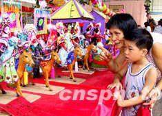 農(nóng)歷七月初七是廣州民間傳統(tǒng)節(jié)日“七姐誕”,廣州番禺區(qū)譚山村的村民在村中的藍(lán)球場(chǎng)上大擺展臺(tái),熱鬧非凡,展臺(tái)上擺滿了一套套傳統(tǒng)故事的人物公仔維妙維肖,展現(xiàn)了嶺南民間文化的藝術(shù)特色。作者:廣東分社羅仰明