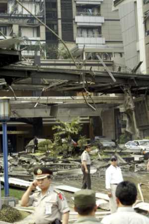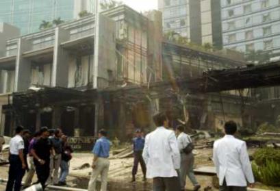 8月5日,印尼首都雅加達(dá)南部的中心商業(yè)區(qū)萬(wàn)豪酒店發(fā)生劇烈爆炸。周圍幾幢建筑也受到爆炸沖擊。據(jù)印尼警方稱,到目前為止至少有8人在爆炸中死亡,另有103人重傷。(春風(fēng))