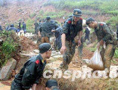 受熱帶風(fēng)暴“莫拉克”影響,8月5日凌晨6時許,福建晉江市磁灶鎮(zhèn)東山水庫一外圍堤壩出現(xiàn)20米長的決口,由于水庫與下游農(nóng)田有約20米的落差,下游的3個村莊、1萬多人口、1000余畝農(nóng)田因此受到嚴重威脅。二千多軍民經(jīng)過5個多小時的搶險奮戰(zhàn),終于堵住決口。作者:徐承彬