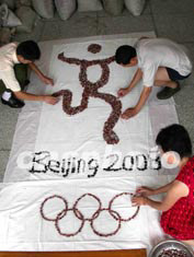 江蘇南京雨花石收藏家曹萍用兩天時(shí)間,從十萬(wàn)枚雨花石中精選出直徑二至三公分的二00八枚精品雨花石,制作了一幅長(zhǎng)二點(diǎn)五米、寬一點(diǎn)八米的北京奧運(yùn)會(huì)徽,以表達(dá)祝愿北京奧運(yùn)會(huì)成功舉辦的美好心愿。作者:陳旻