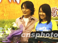臺(tái)灣情歌王子張信哲6日亮相北京,為9月5日在北京工人體育場(chǎng)舉辦的“遠(yuǎn)見名苑之夜--弦情四季”演唱會(huì)做前期準(zhǔn)備工作,演唱會(huì)第一位購票者向張信哲贈(zèng)送鮮花并得到一把小提琴的回贈(zèng)。中新社記者:趙振清