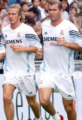 圖為球星貝克漢姆和施丹在訓(xùn)練場上。