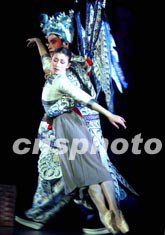 中國中央芭蕾舞團(tuán)新版《大紅燈籠高高掛》夢幻舞中的女學(xué)生熱戀京劇武生趙子龍的夢幻雙人舞,音樂和編舞更具浪漫情結(jié)。中新社記者:賈國榮