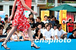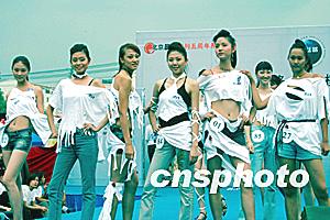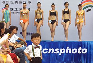 新絲路模特大賽上舉行五分鐘制作“創(chuàng)意T恤”比賽。中新社記者:廖文靜  百余名泳裝佳麗競(jìng)相登場(chǎng)。一名觀眾席上的小帥哥躍躍欲試當(dāng)眾擺出瀟灑姿勢(shì)。中新社記者:廖文靜