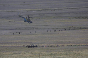 聯(lián)合指揮部迅速作出應(yīng)對(duì)之策,指揮參演國(guó)武裝力量,在空中武裝直升機(jī)、特種空降部隊(duì)和地面裝甲、火炮、特種作戰(zhàn)等部隊(duì)的空地密切配合下,對(duì)非法越界的武裝分子展開了猛烈的攻勢(shì)。