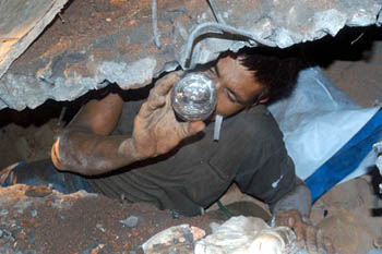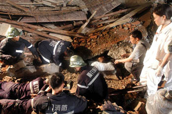 圖:廈門消防人員搶救壓在廢墟中的民工