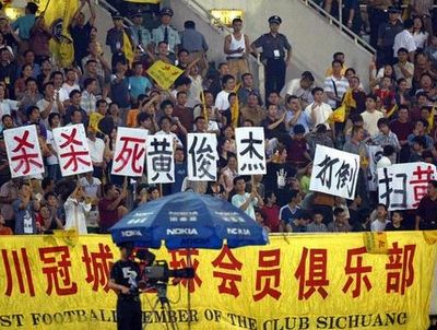 昨日京川之戰(zhàn)的上座率并不高,但球迷的怒氣卻能創(chuàng)下成體之最。比賽第4分鐘,鄒侑根被對(duì)方防守隊(duì)員拉倒,裁判未判點(diǎn)球,“黑哨”的聲音頓時(shí)響起。第43分鐘,現(xiàn)代隊(duì)安德烈將比分改寫為1∶0,部分球迷認(rèn)為這個(gè)進(jìn)球有越位嫌疑。上半場(chǎng)結(jié)束后,黃俊杰到冠城會(huì)員區(qū)附近撿球,馬上引起看臺(tái)上一片騷動(dòng),小旗桿、廢紙團(tuán)冰雹般往黃俊杰身上扔。在回休息室的路上,黃俊杰再次遭到“襲擊”,裝滿水的礦泉水瓶“砰”的砸在球員通道上,記者還能看到里面的人影應(yīng)聲躲閃。下半場(chǎng)開始后,新的標(biāo)語(yǔ)牌在球迷區(qū)舉起,“殺殺殺死黃俊杰”,顯得觸目驚心,部分球迷甚至喊起了帶有人身攻擊的不文明口號(hào)。汪嵩的進(jìn)球被判為越位后,助理裁判朱宏慶也成了被攻擊對(duì)象,2區(qū)的球迷齊齊豎起中指,一邊高喊:“邊裁,小心得‘非典’!”