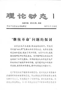 《“繼續(xù)革命”問題的探討》一文,近4500字。文章講了兩個問題:(一)馬列主義關(guān)于不斷革命的思想是否僅限于由民主革命不間斷地轉(zhuǎn)變?yōu)樯鐣髁x革命的思想,而沒有包括社會主義條件下的不斷革命思想?(二)無產(chǎn)階級專政下繼續(xù)革命的對象、任務(wù)是什么。文章重點是講后面一點。
