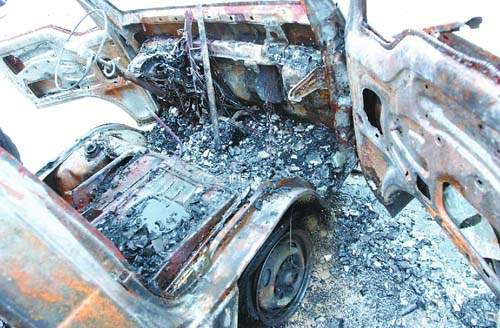 肇事的車子是0.6噸貨車,車上的擋風(fēng)玻璃已經(jīng)完全破碎,前兩輪胎處只剩下架子,方向盤只剩下圓形金屬,以及一把土制手槍、一把尖刀。值得一提的是,在車輛的殘骸上還有大量的塑料桶,有的是藍(lán)色,有的是白色,據(jù)一保安介紹,這些塑料桶是用來裝易燃液體的。昨天上午9時(shí)47分,一輛車身標(biāo)志是“刑事勘察車”的車輛駛?cè)氪逦瘯?huì)大院,從車上走下來數(shù)位警員,現(xiàn)場(chǎng)一共10多名警察不時(shí)交談著什么。最后警察將所有證物搬上車子后方離開。