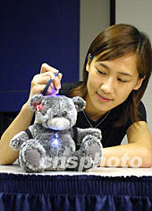香港科技大學物理學系學生,8月14日示范安裝紫外線感應(yīng)器的熊寶寶玩具,該產(chǎn)品以不同顏色的燈(綠、白、藍、紅)顯示紫外線的強度發(fā)出警號。蕭紓昊 攝