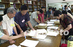 原定于六月進(jìn)行的中國普通高等學(xué)校二零零三年招收華僑、港澳、臺灣省學(xué)生考試,因受“非典”影響改于本月十五日至十七日進(jìn)行,圖為澳門考區(qū)的監(jiān)考老師們在考試結(jié)束后當(dāng)場封卷。中新社記者:李剛