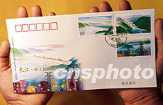 中國(guó)國(guó)家郵政局定于2003年8月20日發(fā)行《長(zhǎng)江三峽工程·發(fā)電》特種郵票1套3枚,三枚郵票的名稱分別為:水庫(kù)蓄水、船閘通航、電站發(fā)電。為配合這套郵票的發(fā)行,北京市郵票公司特設(shè)計(jì)印制了此套郵票的首日封(圖),與郵票同日發(fā)行。中新社記者:鄒憲
