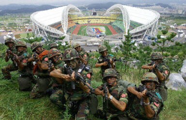 2003年世界大學生運動會將于8月21日至31日在韓國大邱舉行。為了保證即將在開幕的第22屆世界大學生運動會的安全,韓國將動用7,400名警察日夜守衛(wèi)在各地賽場周圍,以保證本屆運動會在安全方面萬無一失。圖為8月19日韓國士兵在大邱主會場附近巡邏。