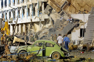 聯(lián)合國駐巴格達(dá)總部“運(yùn)河賓館”于19日發(fā)生了一起大爆炸,爆炸造成了數(shù)十人受傷,房屋受到嚴(yán)重毀損,兩層高的“運(yùn)河賓館”整整一個(gè)角被炸塌。