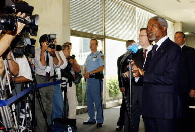 由于聯(lián)合國(guó)駐伊拉克辦事處19日遭汽車炸彈襲擊,安南決定立即中止在芬蘭的休假返回聯(lián)合國(guó)總部。他在斯德哥爾摩作短暫停留時(shí)舉行的記者招待會(huì)上說,無論是對(duì)聯(lián)合國(guó),還是對(duì)伊拉克或整個(gè)國(guó)際社會(huì),這都是一個(gè)“黑色的星期二”,“但我們將繼續(xù)我們的工作,至少我們有責(zé)任不能讓在炸彈襲擊事件中死亡的人白白地犧牲”。